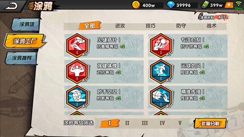 涂鴉是游戲當(dāng)中除了時(shí)裝之外增加球員屬性的唯一方法,不同種類的涂鴉可以增加不同屬性,如增加控球等級(jí)、抗干擾等級(jí)、截球等級(jí)等。
