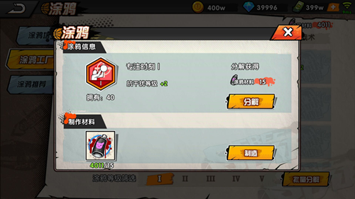 如果你有不需要的涂鴉,同樣是點(diǎn)擊涂鴉工廠選擇不需要的涂鴉,點(diǎn)擊右下角的分解按鈕就可以分解成一定數(shù)量的涂鴉噴漆,等級(jí)越高的涂鴉分解出的涂鴉噴漆就越多。