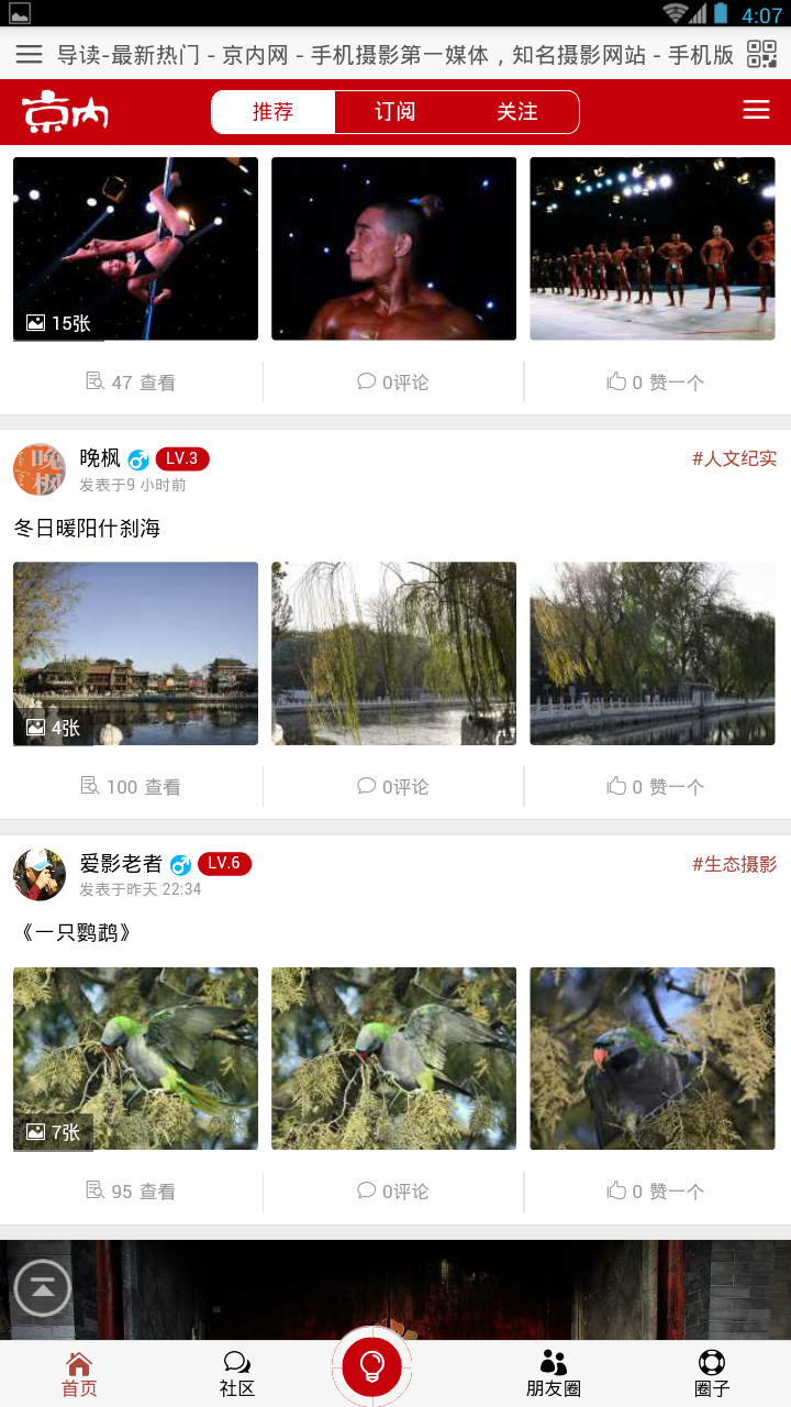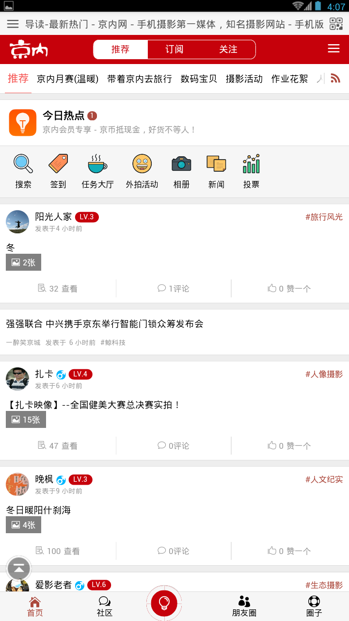 京內(nèi)在線app是一款攝影攝像應(yīng)用,是河南永欣實(shí)業(yè)有限公司打造的手機(jī)攝影服務(wù)平臺。通過京內(nèi)在線app你可查閱攝影資訊信息,了解論壇熱門話題和活動(dòng)信息,以及觀看優(yōu)質(zhì)的攝影作品和技巧信息。