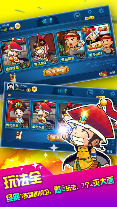 風(fēng)靡全山東的特色經(jīng)典游戲—多樂(lè)保皇,不僅包含單機(jī)版、聯(lián)網(wǎng)版,而且還囊括了青島玩法、威海玩法、濰坊玩法,同時(shí)還分進(jìn)貢、非進(jìn)貢場(chǎng)次。每天數(shù)十萬(wàn)玩家在線,免費(fèi)下載、無(wú)需注冊(cè)、安裝后即可游戲,無(wú)需擔(dān)心人手不夠,每天數(shù)十萬(wàn)玩家在線,分分鐘讓你開始打?;?。