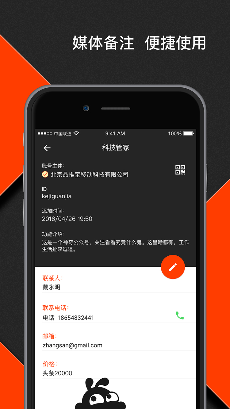 我的掌上新媒體管理中心。旨在服務傳媒人員—隨時隨地掌握媒體動態(tài),打破傳播限制,發(fā)現(xiàn)傳播資源,打造傳媒圈靠譜人脈。讓你換一種方式關(guān)注媒體