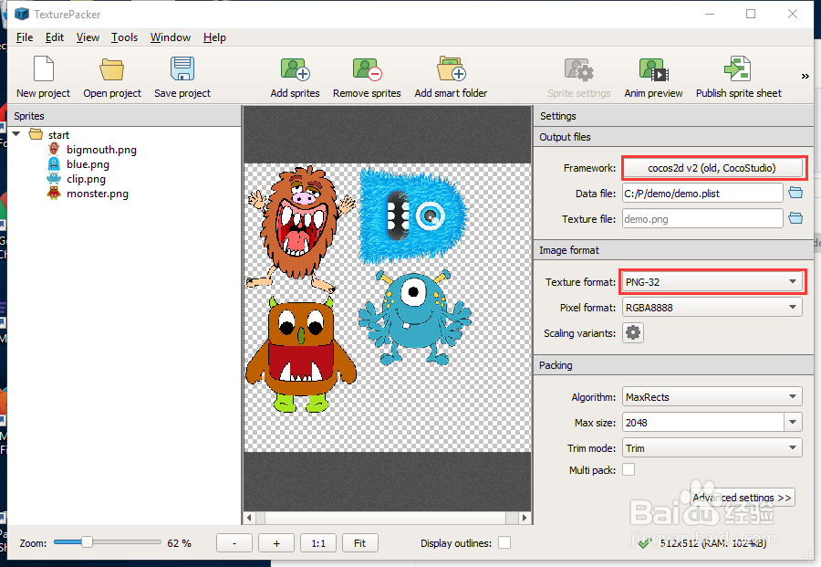 打開 TexturePacker,把圖片素材拖入到 Sprites 里面,為了能將 TexturePacker 導(dǎo)出的.plist 文件能成功導(dǎo)入到 cocos studio 里面,這里必須選擇 Framework 為 cocos 2d v2 (old CocoStudio),然后 Texture format 保持默認的 PNG-32。點擊 Publish sprite sheet。假設(shè)設(shè)置的 Data file 為 demo.plist,則會看見 demo.plist 和 demo.png 文件生成了。