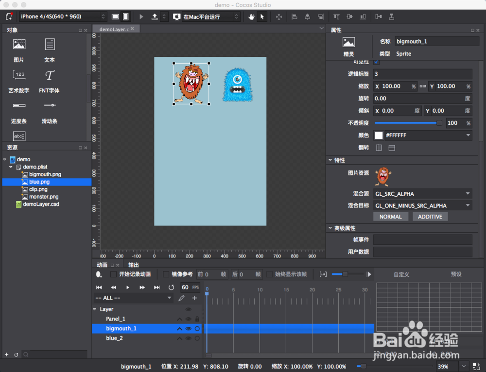 打開 Cocos Studio,把第一步生成的demo.plist 和 demo.png 導(dǎo)入(或者直接拖過去),創(chuàng)建一個測試的 demoLayer,直接可以把 plist 里面的圖片應(yīng)用到 layer 的設(shè)計上面。最后通過 Cocos Studio 導(dǎo)出,我們只需要demoLayer.csb 二進制文件。