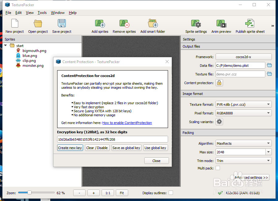再通過 TexturePacker 創(chuàng)建加密的.plist 和.pvr.ccz 文件。我們把 Framework 改成 cocos2d-x,設(shè)置好 Content Protection。注意里面的那32個16進制數(shù)字是密鑰,稍后需要我們才在c++代碼里面設(shè)置好。