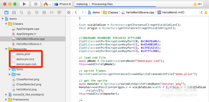 運行程序,.csb 文件和加密的圖片都被成功加載。而我們發(fā)布的資源只有.plist 和那個加密的.pvr.ccz 文件,一定程度的保護了我們的版權(quán)。