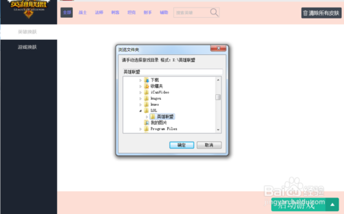 3、然后打開換膚程序,第一次用需要設(shè)置游戲路徑!如圖,我的在D盤,一定要點(diǎn)到英雄聯(lián)盟這個(gè)文件夾哦!