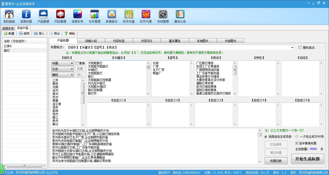 操作簡(jiǎn)單:您只需在對(duì)應(yīng)的窗口填入您產(chǎn)品所有的關(guān)鍵字、型號(hào)、用途、特性等,選擇地區(qū)或在自定義地區(qū)中填入您需要發(fā)布的區(qū)域即可。點(diǎn)擊一鍵生成,稍等下幾千條標(biāo)題已經(jīng)生成,而且每一條標(biāo)題都不重復(fù)!