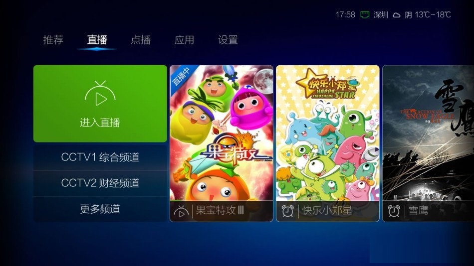 2、進入直播后,按上下鍵切換頻道,按遙控器“OK”鍵調(diào)出頻道列表之后,左右鍵切換頻道分類,每個頻道前面都有個序號,可以直接按遙控器的數(shù)字鍵選擇頻道。