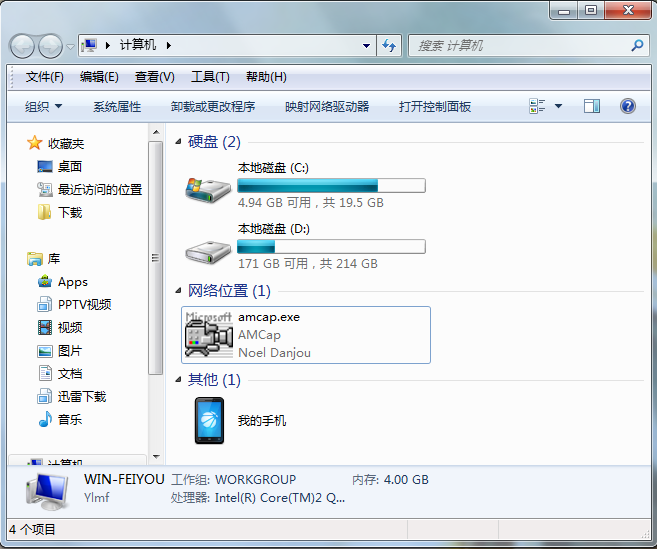 把a(bǔ)mcap.exe文件復(fù)制到路徑C:\Users\Administrator\AppData\Roaming\Microsoft\Windows\Network Shortcuts中??梢灾苯訌?fù)制路徑,把“(Administrator)”改成你的用戶名,然后粘貼到我的電腦上面的地址欄就能直接打開該路徑了。(如果一步步打開的話,“Users”的文件夾名稱可能會(huì)是“用戶”的,選擇的時(shí)候要注意。)把a(bǔ)mcap.exe復(fù)制到Network Shortcuts 之后,打開“計(jì)算機(jī)”你就會(huì)看見里面多了個(gè)amcap.exe應(yīng)用程序了。雙擊就能打開使用。