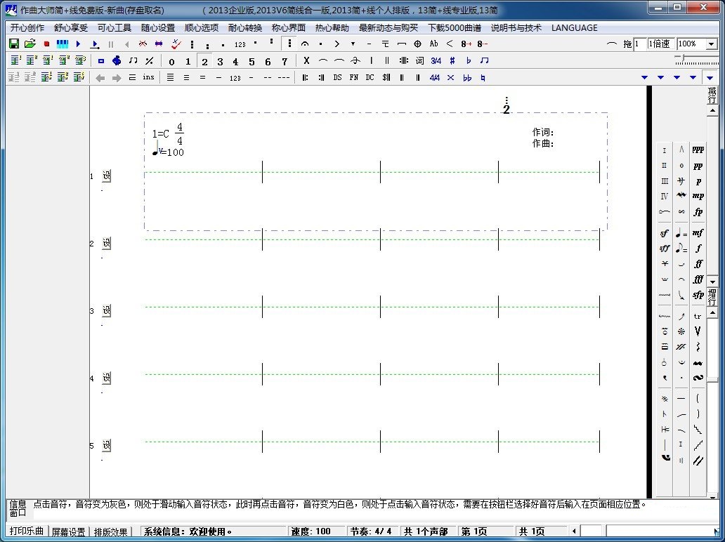 本軟件是風(fēng)雅軟件公司推出的最新免費(fèi)版作曲大師,內(nèi)含作曲大師簡(jiǎn)譜和五線譜軟件全功能免費(fèi)版以及最新的V6簡(jiǎn)譜五線譜混排互換版并支持簡(jiǎn)譜和五線譜鼓譜。作曲大師V6是風(fēng)雅公司面向音樂(lè)工作者和音樂(lè)教學(xué)的旗艦產(chǎn)品,可讓您只創(chuàng)作一種樂(lè)譜,任意以簡(jiǎn)譜、五線譜、簡(jiǎn)線對(duì)照譜的形式分發(fā)和傳播,節(jié)約您寶貴的創(chuàng)作時(shí)間。對(duì)于音樂(lè)教學(xué),能提高學(xué)生的音樂(lè)興趣,盡早培養(yǎng)出中國(guó)急需的識(shí)別多種樂(lè)譜的人才,免除了學(xué)習(xí)眾多風(fēng)格不一的各類音樂(lè)軟件產(chǎn)生的混淆和不便。對(duì)于樂(lè)隊(duì),可以同時(shí)滿足只能識(shí)別單一樂(lè)譜的成員協(xié)同演奏。支持簡(jiǎn)譜和線譜混合排版和互換,支持A3、A4、16K的橫排和豎排。最新支持寬屏幕顯示、支持橫向排版和打印功能,可調(diào)節(jié)一行的音符數(shù)量。可同時(shí)處理簡(jiǎn)譜、五線譜、簡(jiǎn)譜節(jié)奏譜、簡(jiǎn)譜鼓譜、五線譜鼓譜五種樂(lè)譜的編排、演奏打印,支持音符大小調(diào)整。支持簡(jiǎn)譜和五線譜的混合編排和互換。