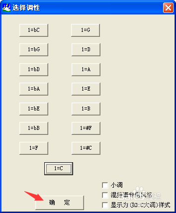 更改調(diào)性方法。如何改調(diào)號(hào)呢?單擊下圖所示的調(diào)性按鈕,選擇一個(gè)調(diào)性,單擊確定。光標(biāo)移到默認(rèn)的調(diào)號(hào)處,單擊一下,就改變調(diào)性了。當(dāng)然嘍《小毛驢》是C調(diào)無(wú)須改變。