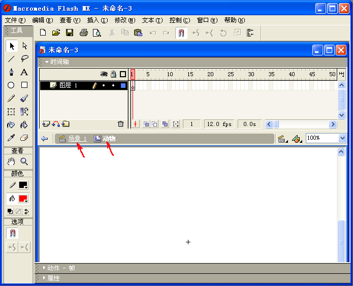 3,進(jìn)入元件編輯中(注意和場景編輯的區(qū)別,沒舞臺,全白。并在場景1后面多一個"動物"元件名稱)