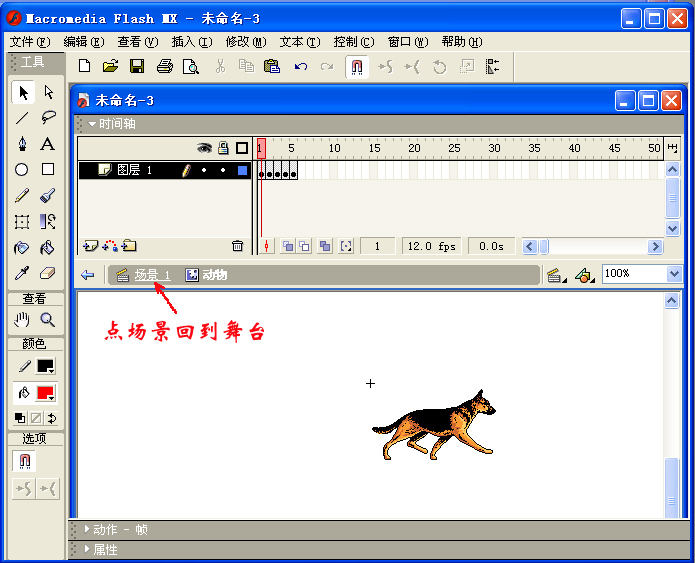28,同理,讓背景不動狗移動效果如下圖,方法:第一層背景圖片不做"補(bǔ)間動畫",第二層,元件拉入后,對狗做補(bǔ)間動畫(也可以弄成其他效果):