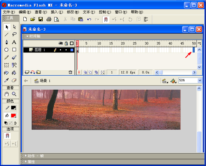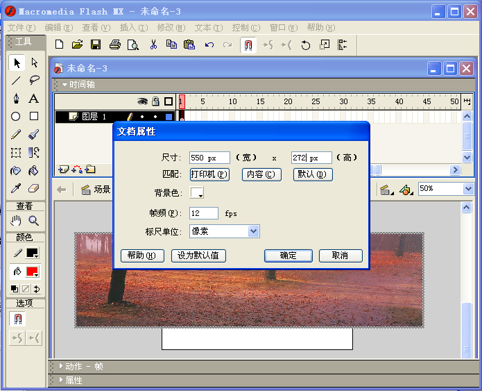 12,再設(shè)置舞臺:雙擊寫著"12。0 fps"幾個字,彈出"文檔屬性"面板,只把高度設(shè)置成272(和圖片同高)
