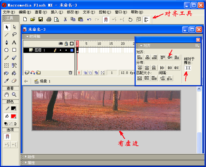 13,點(diǎn)"對齊工具"(在幫助下行),彈出對齊窗口,先點(diǎn)"相對于舞臺"按鈕。再點(diǎn)對齊符號中的第五個符號(垂直中齊),圖片和舞臺吻合。