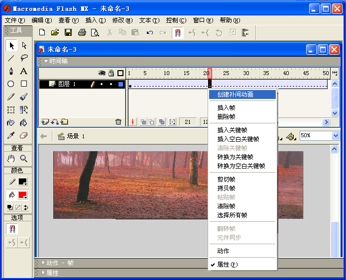 16,在1-50中間任意位置右擊,彈出窗口,點(diǎn)"創(chuàng)建補(bǔ)間動畫",1-50變成灰藍(lán)色和虛線: