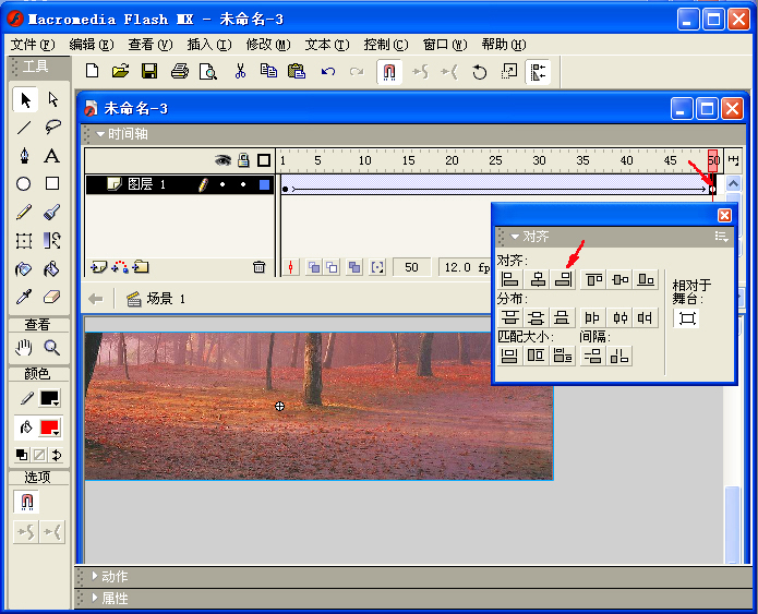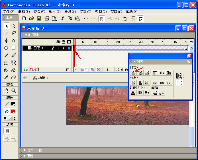 20,點(diǎn)選首幀,點(diǎn)對齊工具中對齊符號的第一個,讓圖片左邊緣和舞臺坐邊緣對齊:
