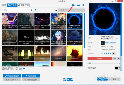啟動(dòng)你的wallpaper engine軟件進(jìn)入到它的界面 。然后選擇箭頭指向的圖標(biāo)