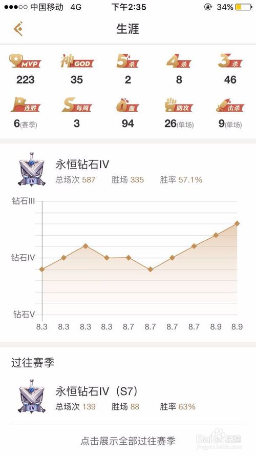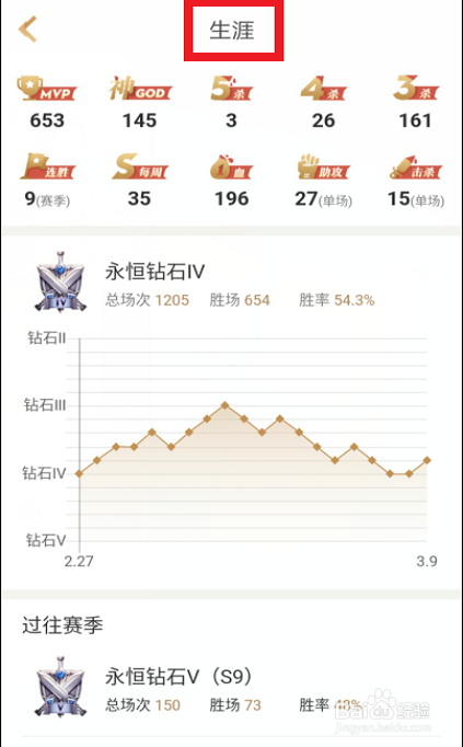 點開后里面則是我們的職業(yè)生涯,由圖片我們可以只曉的很直觀,就連段位變化的幅度都顯示的很清楚,如果往下拉還有往賽的歷史最高段,包含勝率和總勝場。