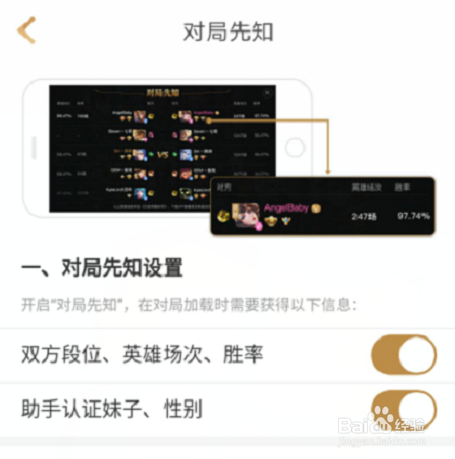 這里就是為重的輔助功能咯,選項在戰(zhàn)績左處,上面所顯示的功能都需權(quán)限開啟,其中最有效的功能屬“對局先知”了,截圖上面就為開啟后的效果,敵自雙方的英雄場、甚至段位都一清二楚。