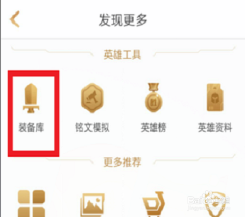 如果要找裝備及英雄資料等工具在哪里,按觸左上圓圈中的頭像,然后擊“發(fā)現(xiàn)更多”漢字——“裝備庫”這一格圖。
