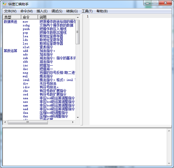 1、可實現(xiàn)對匯編命令的查找和編輯操作。2、軟件內(nèi)收集了常用匯編命令和說明,使用時在命令列表雙擊可將指定命令添加至代碼編輯區(qū),你也可自行添加和刪除列表中的命令。