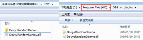 如果為32位,請將下載下來的小葫蘆斗魚TV隨機(jī)彈幕插件.zip解壓將32位文件夾里的ZhanqiRandomDanmu.dll文件和ZhanqiRandomDanmu文件夾復(fù)制到Program Files(x86)的OBS的安裝目錄的plugins文件夾下。