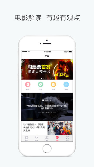 第一步:在你手機(jī)上點擊“淘票票”,在起最下面的有“電影”、“影院”、“演出”、“發(fā)現(xiàn)”和“我的”五個按鈕選擇。