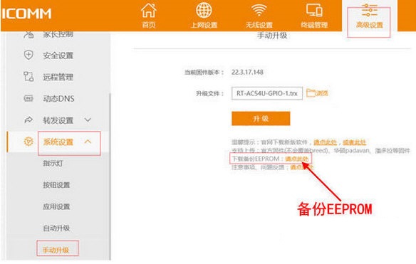 5、進(jìn)入高級設(shè)置->系統(tǒng)設(shè)置->手動(dòng)升級->點(diǎn)擊此處備份EEPROM。