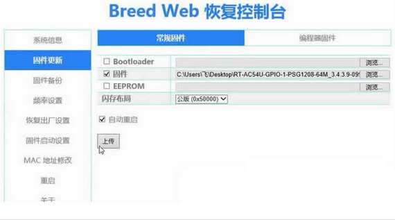 5、恢復(fù)固件方法:固件更新->選中右側(cè)固件->瀏覽找到固件點(diǎn)擊上傳即可。