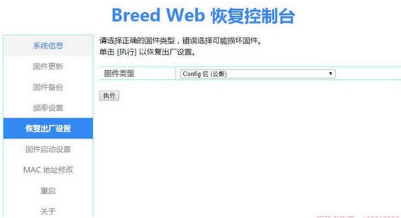 4、恢復(fù)固件之前最好在Breed Web恢復(fù)控制臺(tái)恢復(fù)一下出廠設(shè)置,固件類型:Config區(qū)(公版),如下圖。