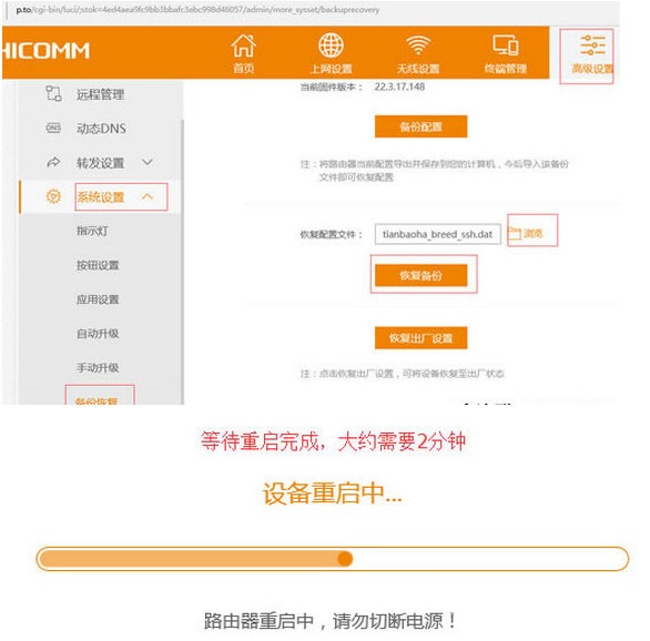 3、進(jìn)入:高級設(shè)置->系統(tǒng)設(shè)置->備份恢復(fù)->瀏覽->選擇下載的tianbaoha_breed_ssh.dat->點(diǎn)擊恢復(fù)備份等待進(jìn)度條完成(大約需要2分鐘)。