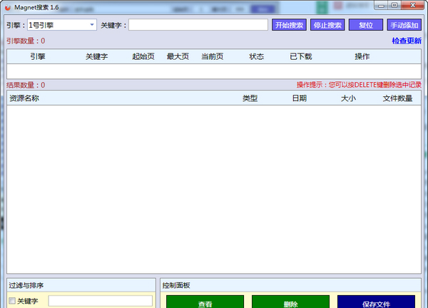1.支持多個搜索引擎同時搜索,要搜索資源,先添加搜索引擎,可以多次添加同一個引擎搜索不同的關(guān)鍵字2.對于搜索到的結(jié)果支持篩選,排序,查看,復(fù)制,刪除,保存到文件,從文件讀取等功能