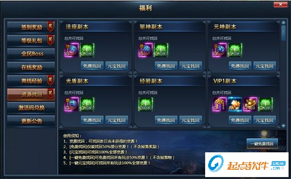 1、前一天沒時(shí)間做副本、任務(wù),參加不了活動(dòng)沒關(guān)系,資源找回系統(tǒng)可以幫你找回在副本中的收益。