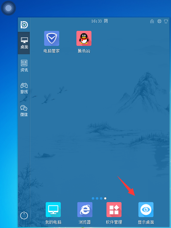 1.安裝iDesk助手后,系統(tǒng)桌面圖標(biāo)不見了 ( 恢復(fù)桌面圖標(biāo) ) ?很多用戶在安裝iDesk助手以后或者使用過程中隱藏桌面圖標(biāo),發(fā)現(xiàn)系統(tǒng)桌面圖標(biāo)不見了,恢復(fù)系統(tǒng)桌面圖標(biāo),首先找到iDesk助手桌面圓形懸浮球, 然后鼠標(biāo)移動至懸浮球上,點(diǎn)擊鼠標(biāo)右鍵,選中‘顯示桌面’選項(xiàng),即可看到系統(tǒng)桌面圖標(biāo).在使用過程中,在軟件面板空白處,點(diǎn)擊鼠標(biāo)右鍵,選中‘顯示桌面圖標(biāo)’ 也可顯示系統(tǒng)桌面