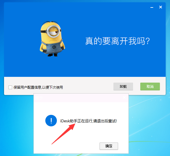 (3)、如果在卸載iDesk助手時(shí),出現(xiàn)如下圖所示提示,請先’退出‘iDesk助手,等待1~2秒鐘,即可卸載