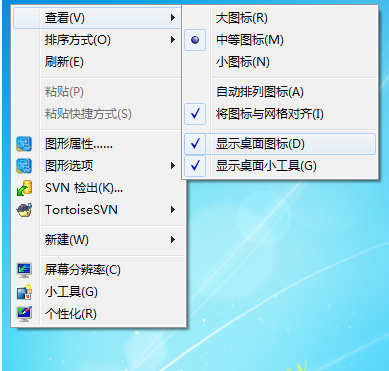 桌面空白處點(diǎn)擊鼠標(biāo)右鍵,選中‘查看’->點(diǎn)擊'顯示桌面圖標(biāo)',此時(shí)‘顯示桌面圖標(biāo)’應(yīng)不是勾選狀態(tài),此時(shí)再點(diǎn)擊鼠標(biāo)右鍵,選中‘查看’->點(diǎn)擊'顯示桌面圖標(biāo)'即可顯示。如下圖所示: