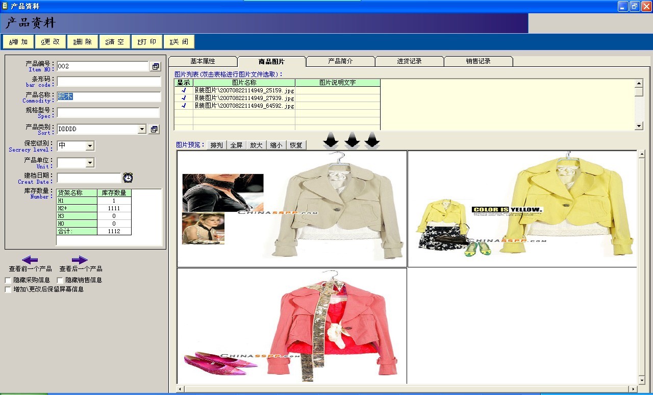 ◆產(chǎn)品圖片信息:系統(tǒng)可以將樣品的圖片關(guān)聯(lián)到樣品資料中,并且可以進(jìn)行放大、縮小、全屏預(yù)覽,實(shí)現(xiàn)直觀(guān)、一目了然的查看樣品,一個(gè)產(chǎn)品可以附加10個(gè)樣品圖片。