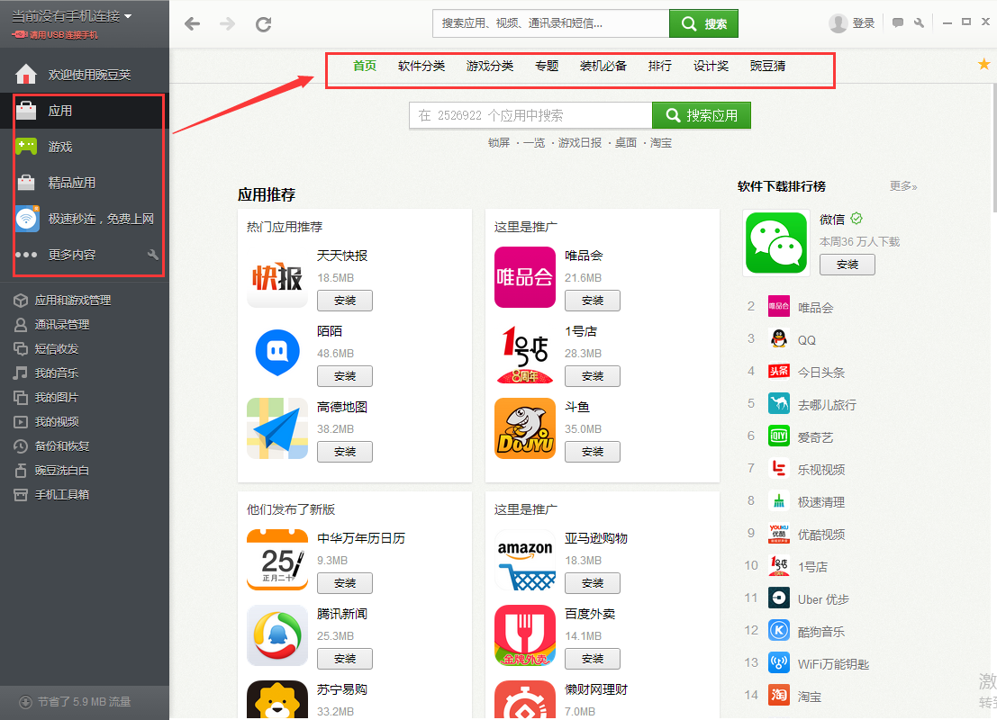 STEP 2 : 開啟桌面豌豆莢點(diǎn)擊豌豆莢窗口中的連接手機(jī)按鈕;