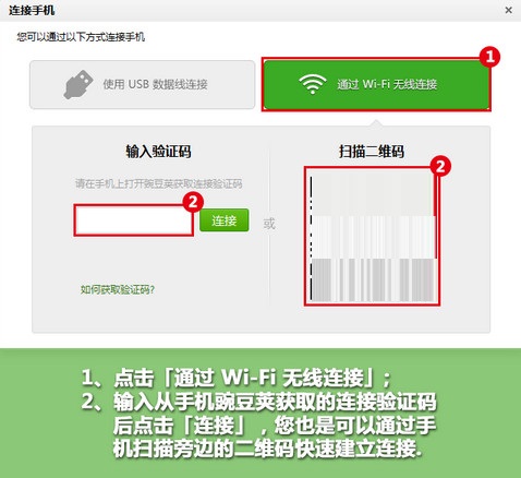 STEP 3:在桌面端輸入手機(jī)的驗證碼,如果連接順利你的手機(jī)便與豌豆莢建立了Wi-Fi連接;