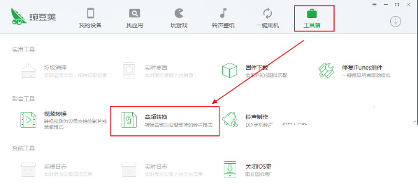 豌豆莢如何轉(zhuǎn)換音頻格式?1、在電腦上打開豌豆莢,然后在它的“工具箱”中打開“音頻轉(zhuǎn)換”功能,如下圖所示: