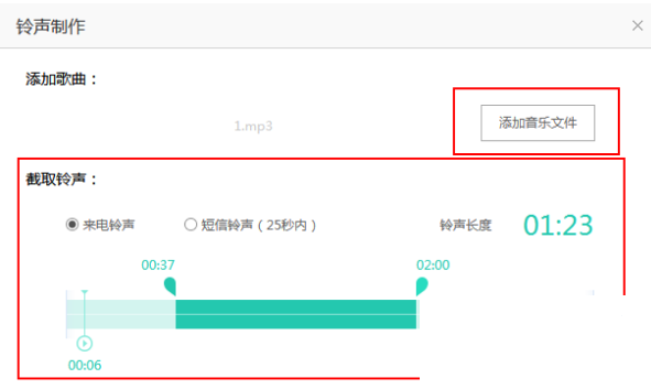 2、在“鈴聲制作”界面點(diǎn)擊“添加音樂文件”,并將想要剪輯成鈴聲的音樂添加進(jìn)來,選擇一下是要制作來電鈴聲還是短信鈴聲,來電鈴聲不限制鈴聲長度,短信鈴聲不能超過25秒;