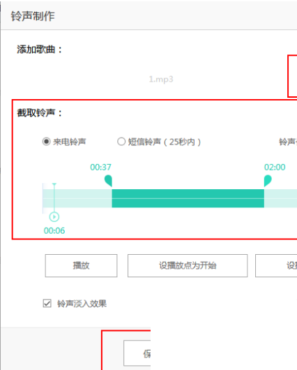 3、之后通過拖動進(jìn)度條上的兩個按鈕來設(shè)置鈴聲的起點(diǎn)以及終點(diǎn),調(diào)整完畢后點(diǎn)擊“保存到本地”就可以了;