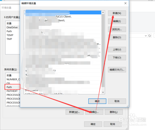 在系統(tǒng)變量里找到【path】并選中,然后點擊下方的【編輯】按鈕,在彈出的編輯環(huán)境變量對話框里,點擊右側(cè)的【新建】,如下圖所示。
