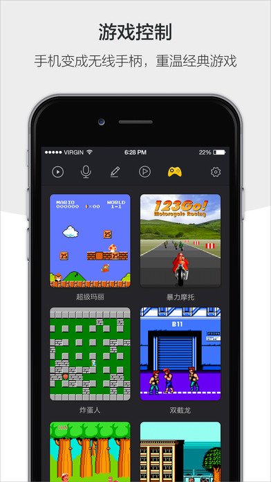 游戲功能(New)——手機(jī)化身游戲手柄,玩游戲更加得心應(yīng)手,現(xiàn)支持超級(jí)瑪麗、暴力摩托、炸彈人,雙截龍,冒險(xiǎn)島,熱血足球,三目童子,雪人兄弟,馬戲團(tuán),激龜快打,影子傳說(shuō)等經(jīng)典游戲,也支持神廟逃亡等熱門(mén)游戲,后續(xù)將支持更多更好玩的游戲;