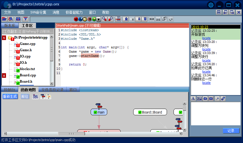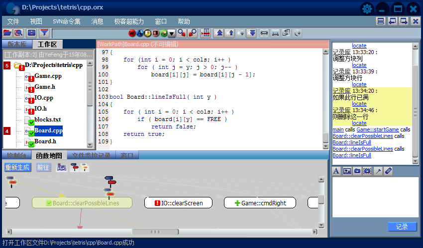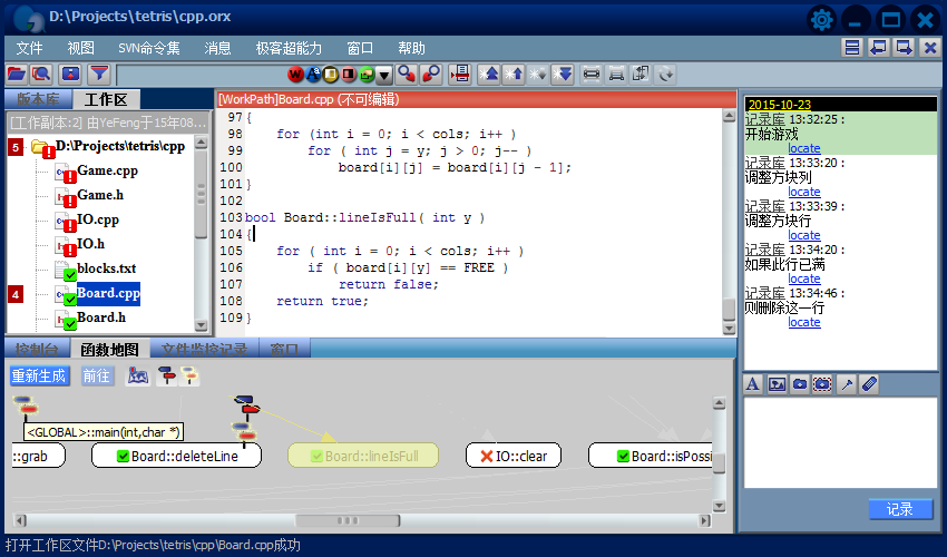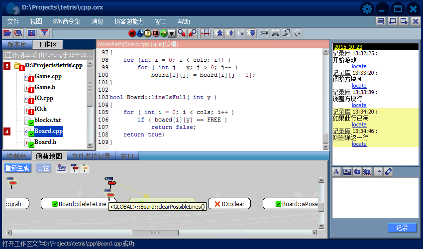 4.消息更豐富的表現(xiàn)形式帶來了更強大的功能,除了充當(dāng)閱讀源代碼時的注釋,還能在版本庫導(dǎo)航欄中指示某個版本,某處代碼的修改;在函數(shù)地圖中建立消息路標(biāo),指出其它代碼與它的調(diào)用關(guān)系。