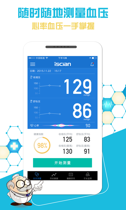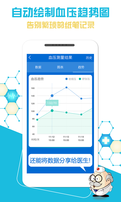 『歷史數(shù)據(jù)』自動(dòng)記錄血壓繪制血壓數(shù)據(jù)趨勢圖,幫您統(tǒng)計(jì)分析,免去繁瑣的紙筆記錄;