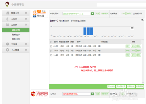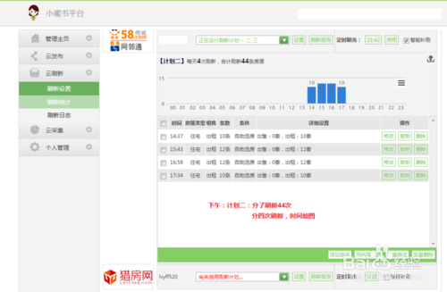 3、房產(chǎn)小蜜書的云刷新功能是我的最愛,因?yàn)樗梢栽O(shè)置個(gè)性化的刷新方案。并且同時(shí)啟用多套刷新計(jì)劃,保證了我的房源能夠及時(shí)刷新,而且刷新速度非???,設(shè)置起來(lái)很靈活;