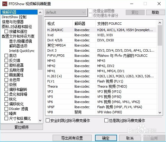 ffdshow采用libavcodec解編碼庫和一些免費(fèi)的開放的軟件開發(fā)包解碼大多數(shù)常規(guī)的格式,例如:MPEG-4 (包括視頻解碼Xvid, 3ivx, 和全部版本的DivX).Flash Video, H.263。