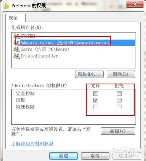 回到權(quán)限窗口,選擇“安全”,在Administrators的權(quán)限選擇完全控制并允許,這樣注冊表的Preferred項(xiàng)進(jìn)行修改。